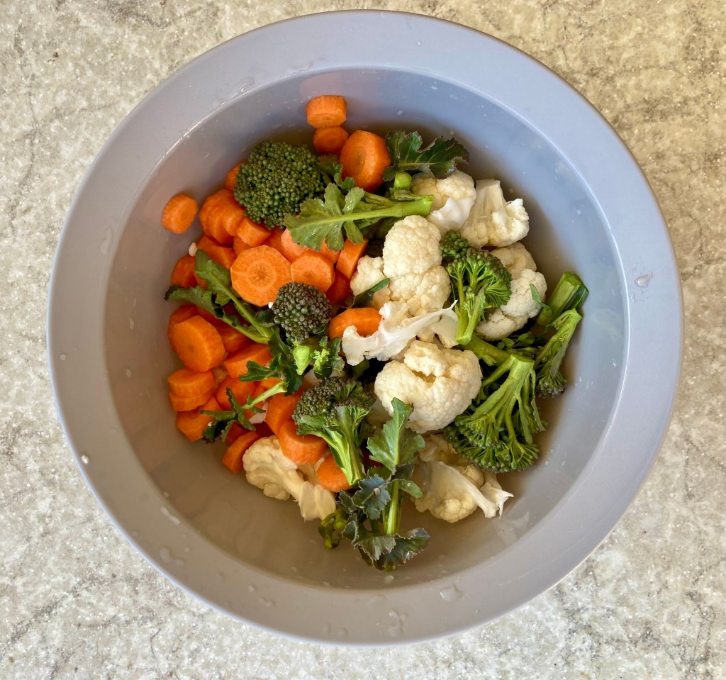 A répát megpucolom s összevagdosom, a hagymát apróra vágom, a fokhagymát lereszelem vagy összenyomom fokhagymanyomóval. A brokkolit, karfiolt kicsi rózsákra szedem (a szárát meg felkockázom, ha van neki, lásd az összetevők leírásában).