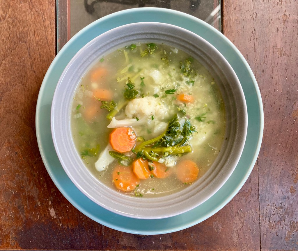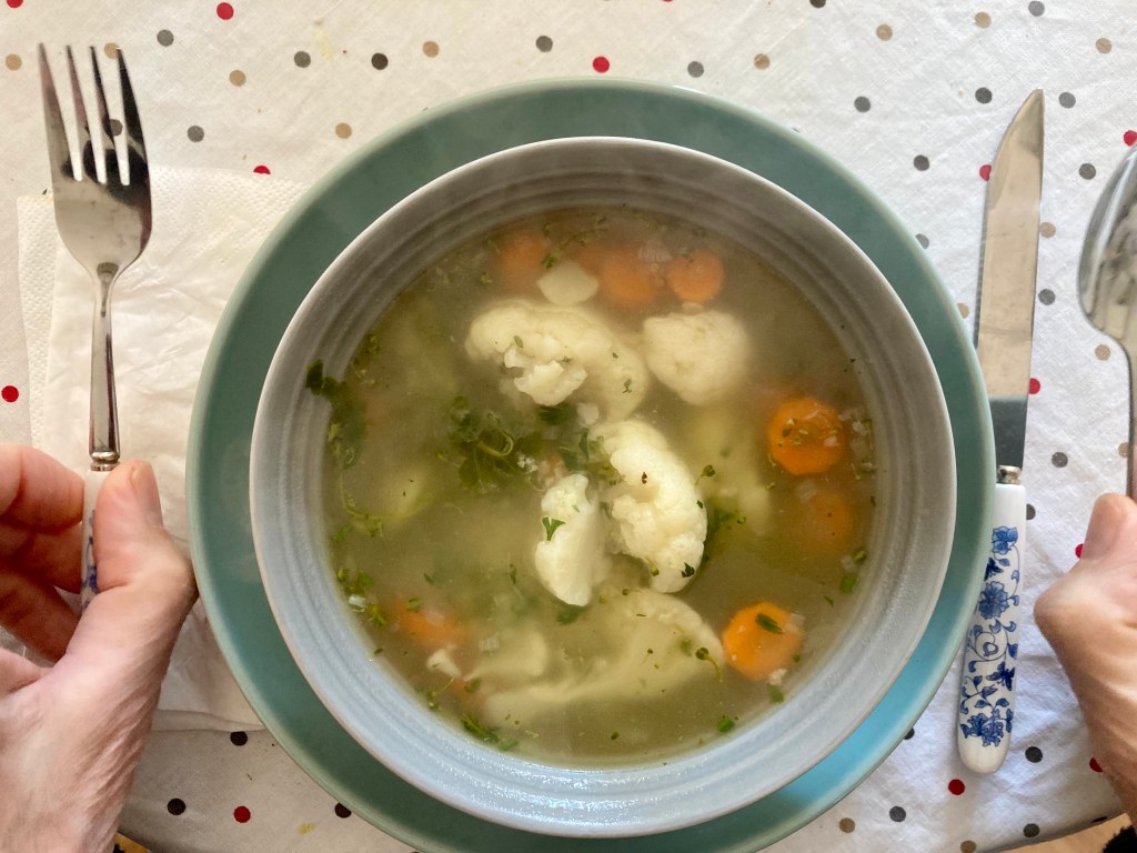 Mindenesetre addig is, míg eljutok odáig, maradok az általam elültetett dolgoknál, amikről jó eséllyel feltételezem, hogy nem csak egyszer ehetők, mint a mérges gombák 😀 Szerencsére még ilyenkor is elég sok mindent tudok lelni: ha kicsit rendesebb idő van (értsd: nem fagy nagyon), szokott lenni egy kis mángold, a tavaly elvetett fodros kelen is van még pár levél – bár úgy néznek ki szegények, mint egy sor mini pálmafa, mivel az alsó leveleit már lelegeltük -, és a brokkoli is időről időre hoz pár oldalhajtást. Viszont mivel nem brokkolimezőről van szó, csak pár tő növényről, általában egy ebédre nem (sem) elég, amit le tudok szedni, szóval valamivel muszáj kiegészíteni. Ilyenkor általában egy currybe vagy a köretbe dobom bele a kertben talált cuccokat, de most úgy voltam vele, inkább csinálnék valami levest, mondjuk a hűtőben árválkodó kis darab karfiollal keverve (ami önmagában szintén nem elég semmire).