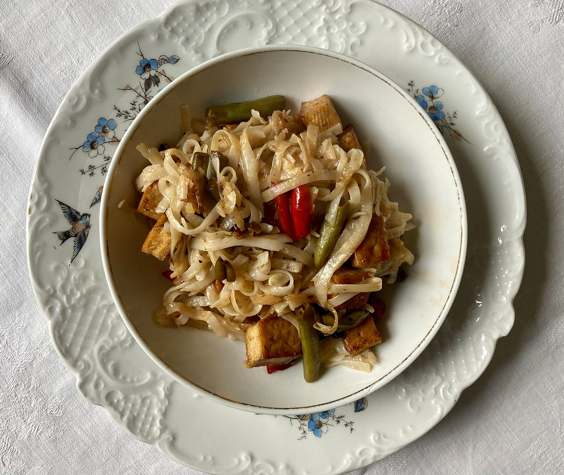 Tehát volt ázsiai rizstészta, tofuval és zöldségekkel, ami jelen esetben maradék zöldbabot és kápia paprikát jelentett: