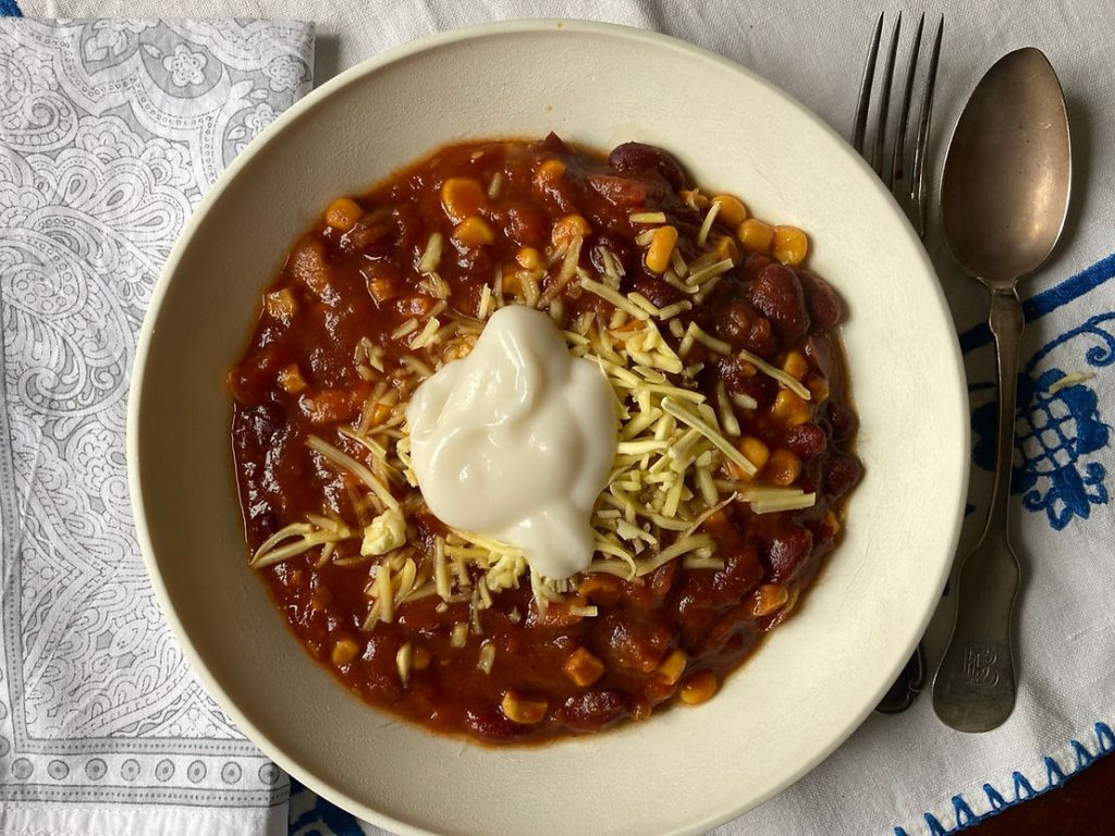 A többi napon viszont főztem, többé-kevésbé azt, ami a menüben írva volt – egyebek közt pl. megcsináltam életem első chilis babját! Pista szerint is finom lett, ráadásul minimális vagdosást és felügyeletet igényelt, úgyhogy egyértelműen felvesszük a repertoárba. A recept szerinti tortillachips helyett simán tortillával ettük, meg a házi növényi joghurt maradékával, és az előző hétről maradt Trapi csücskét is ráreszeltem.