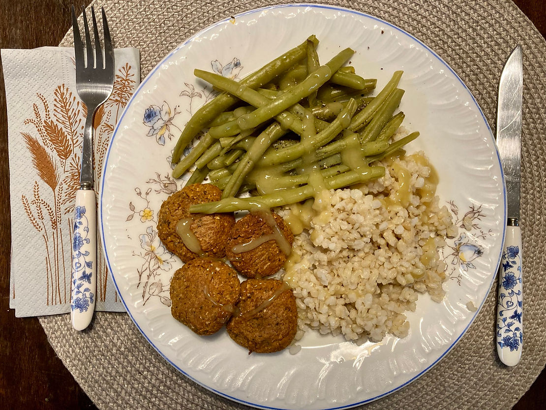 Itt meglehetősen eltértem az eredeti recepttől, csak a falafel maradt meg belőle, s hozzátettem a maradék rizst, meg a hűtőben árválkodó zöldbabot