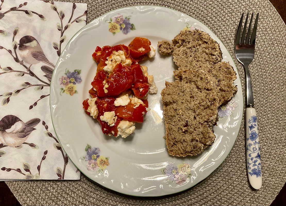 Ez egy vacsi volt: hivatalosan fetás sültpaprika saláta, gyakorlatilag morzsoltam rá egy kis tofut – finom volt!
