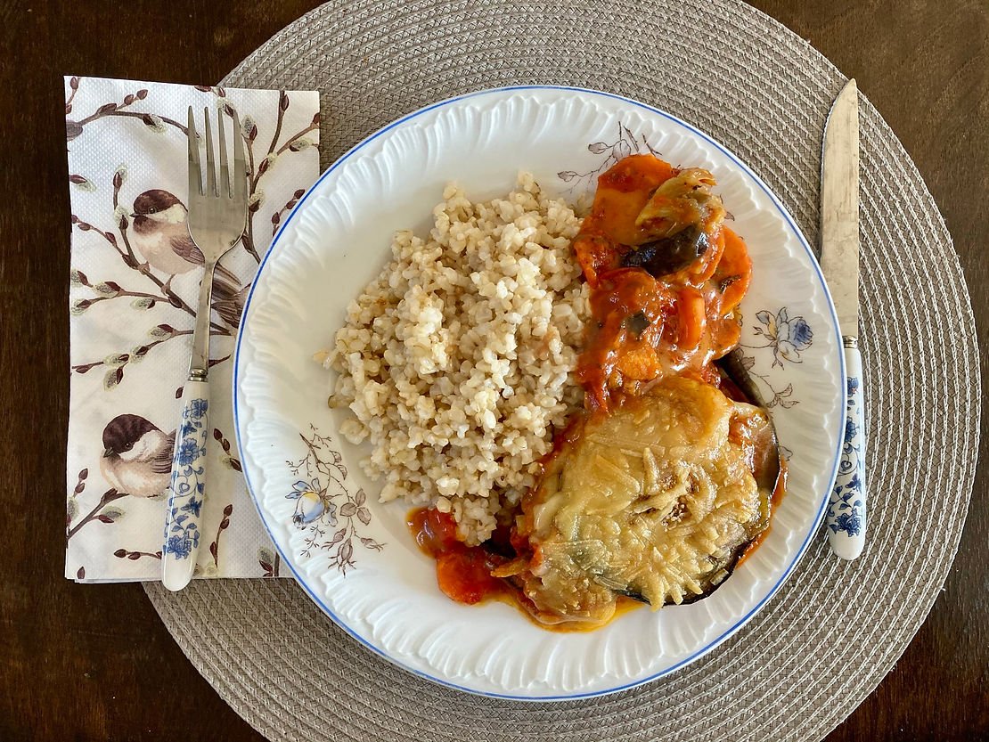 Ezt a padlizsános ételt kellett volna bulgurral enni, ami helyett barnarizst főztem. És erre is került egy kis Trapi – de szerintem simán anélkül is finom lenne, majd kipróbálom!