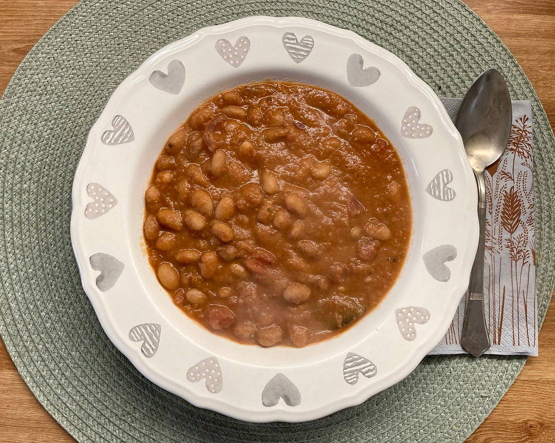 A főzeléket a recept szerint is önmagával kellett sűríteni: pár kanálnyit kivenni belőle, összeturmixolni, aztán vissza. Ezt mondjuk úgy oldottam meg, hogy elegánsan belelengettem a botmixert a lábosba 🙂 a végeredmény ugyanaz, csak kevesebbet kell mosogatni! A paradicsomos babfőzelék viszont irtó finom lett, meg is beszéltük, hogy felvesszük a repertoárba. A menü tükörtojást írt hozzá, de pirított tofukockákkal is jó volt ám…