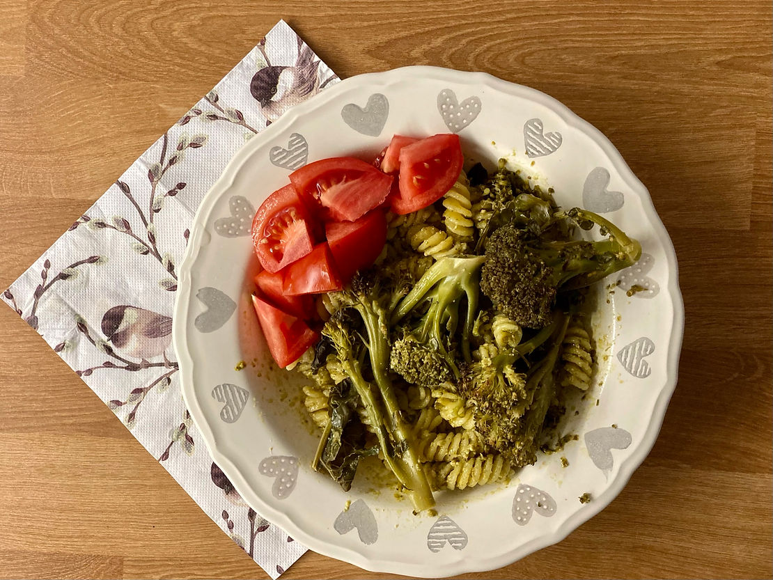 Ez pedig a tésztás étel, nevezetesen pestos tészta brokkolival és paradicsommal. A recept szerinti mozarellát kihagytam, de nem hiányzott belőle.