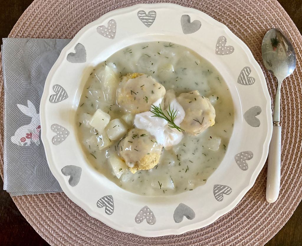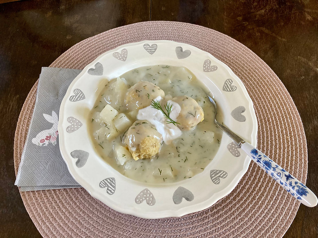Tálaláskor a gombócokat leöntöm a karalábés szósszal, és még egy kis joghurtot biggyesztek a tetejére. Mi kenyérrel esszük, de lehet hozzá csinálni főtt, vagy sütöben sült krumplit is akár.